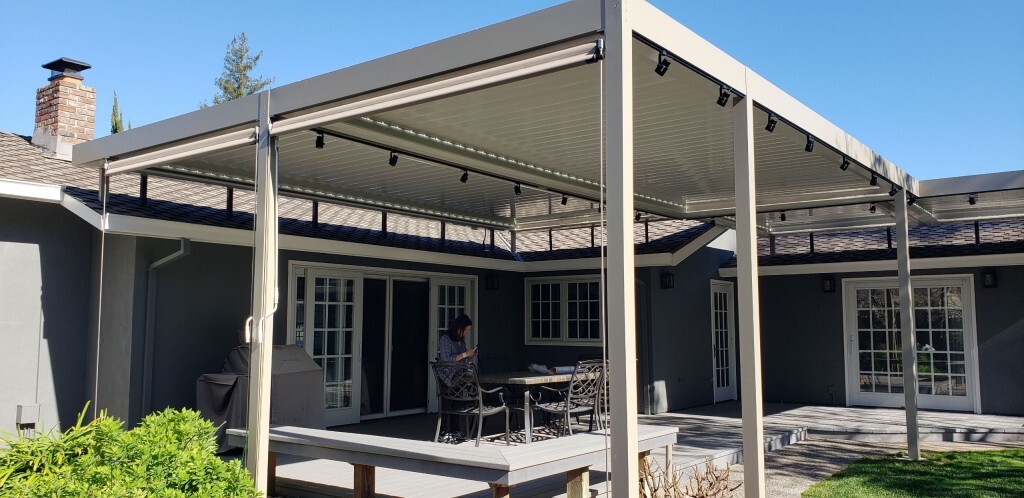 It’s an outdoor cover with adjustable or retractable louvers that allow you to control sunlight, shade, airflow, and rain protection.