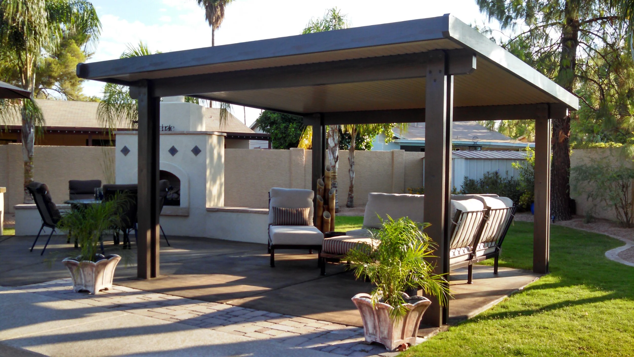 • Attached patio covers create a seamless extension of the home and are ideal for patios directly connected to indoor living areas.